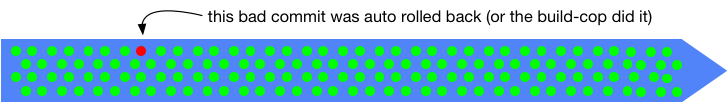 If an executive manager visited the development team and commanded “Competitor X has launched feature Y, go live now with what we have”, the worst response would be “give us one hour”. The development team might have been very busy with tricky or even time-consuming tasks (therefore partially complete), but in an hour, they are able to go live with something just stabilized from the trunk. Perhaps they can do it in less than, an hour. The rule, though, is to never break the build, and always be release ready because the CIO or the business may surprise you.