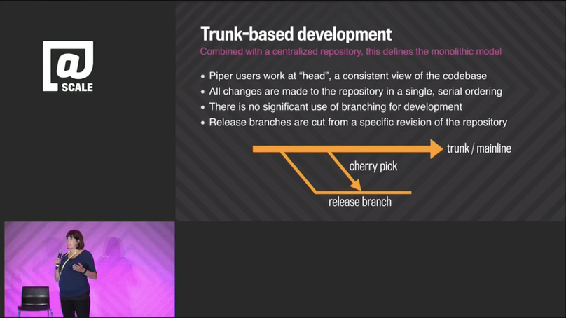 “So at Google we do what’s called Trunk-Based Development. I should note that it is the combination of Trunk-Based Development with a centralized repository that really defines the monolithic model of source code management. So what Trunk-Based Development means for us that typically Piper users all work from HEAD or a single copy of the most recent version of the codebase. When developers commit to Piper their changes are immediately visible and usable by other engineers. Branching for development at Google is exceedingly rare and Trunk-Based Development is beneficial partly because you avoid the painful merges that often occur when you need to reconcile long lived branches. Branches however are used for releases. So a release branch is typically a snapshot from trunk with an optional number of cherry picks that are developed on trunk and then pulled into the branch.”