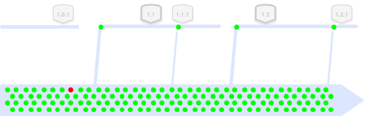 Brad Appleton points out that many do not realize that branches can be created retroactively. That is taken advantage of here in the case of bugs after “release from a tag”, or even changes for point releases.