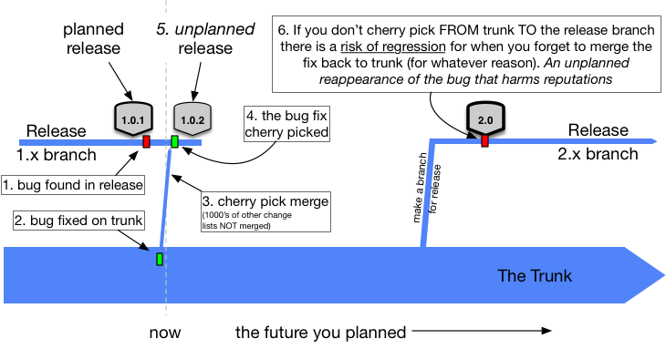 We’ve bolded the cherry-pick bit ourselves. Readers with beady eyes will note that Rachel alludes to dev branches other than trunk for ‘rare’ reasons. We may cheekily suggest that Google should learn a little more about Branch by Abstraction.