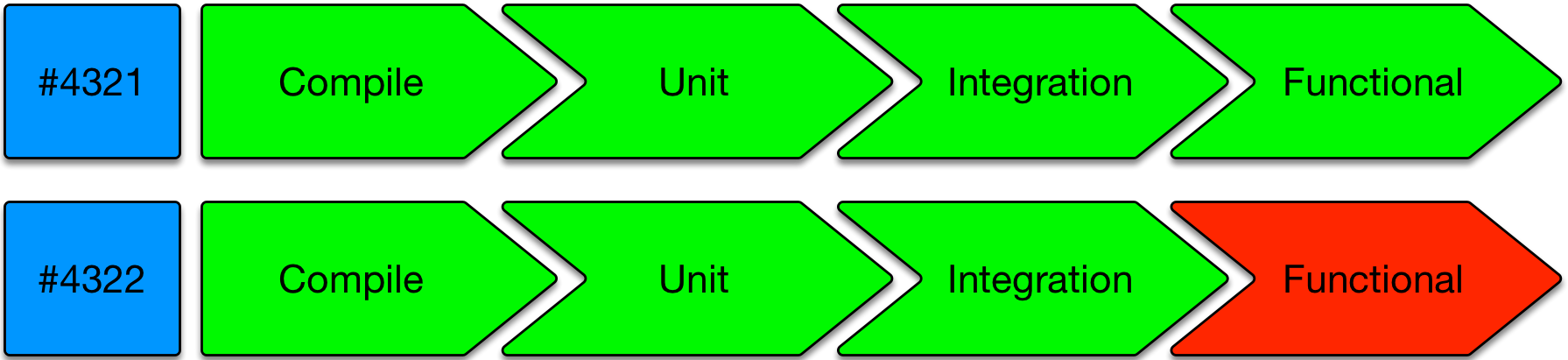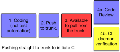 Note: for committing/pushing straight to the shared trunk, code review and CI verification can happen in parallel. Most likely though is reviews happening after the CI daemon has cast its vote on the quality of the commit(s).