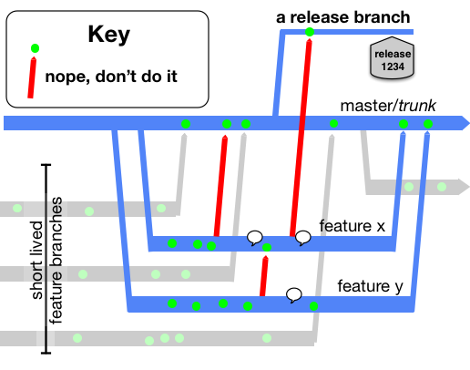 Say two features are being worked on concurrently: features X and Y. Both will take a day to complete, and two developers are working independently on them. Or four developers if pair-programming is that team’s way. The reality of the merge back to master/trunk, before the deletion of the short-lived feature branch, is that the a merge of changes from master/trunk is often needed, before the merge to master/trunk.