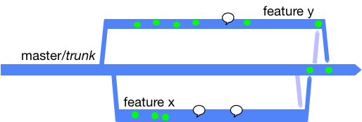 Either as branching directly off master, or in a fork of the whole repository. These branches are destined to come back as “pull requests” into the master/trunk.