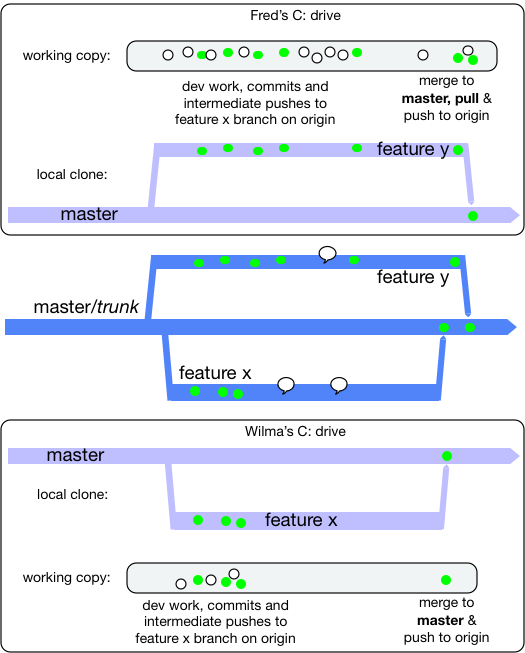 While each developer works, they maintain a local clone of the master/trunk and their own short-lived feature branch only. Indeed for a period of time, their short-lived feature branch may not yet exist in the shared origin repo.